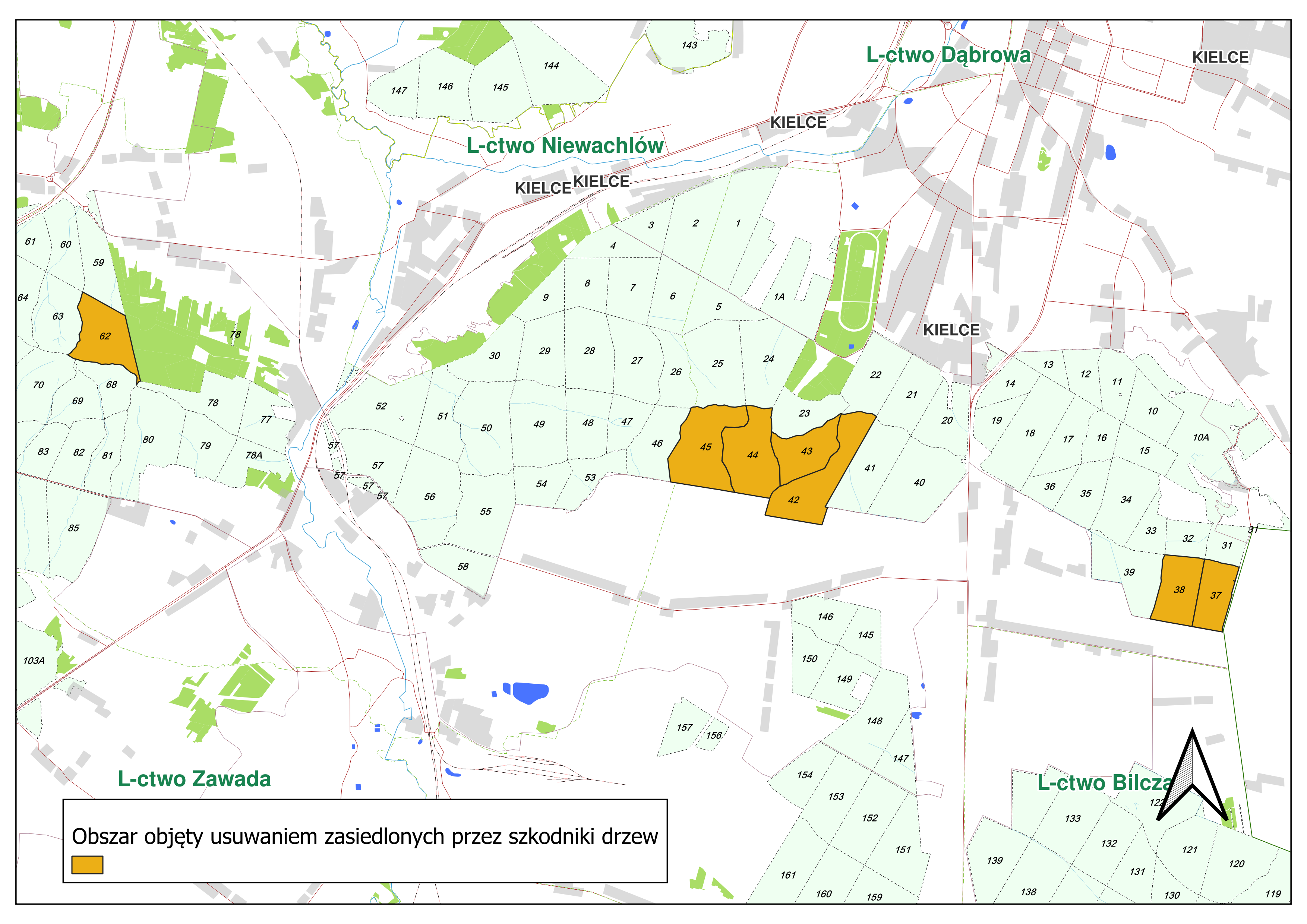 Usuwanie zasiedlonych przez szkodniki wtórne drzew obejmie obszary leśne w Leśnictwie Słowik (oddział 62a) oraz Leśnictwie Dyminy (oddziały 37, 38, 42, 43, 44, 45), które znajdują się na tzw. „shadow list” i na terenach lasów społecznych.