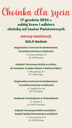 Dziękujemy za zrozumienie i prosimy o wzmożoną ostrożność podczas przebywania w okolicach wyznaczonych prac terenowych. Miejsca prowadzenia prac leśnych zostaną odpowiednio oznakowane za pomocą tablic informacyjnych.