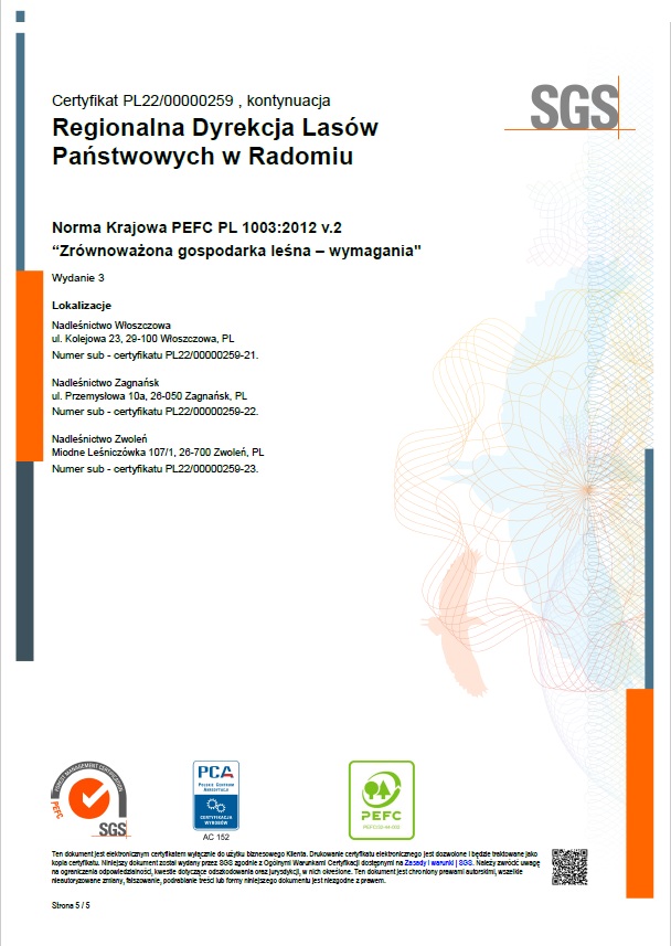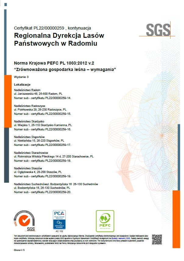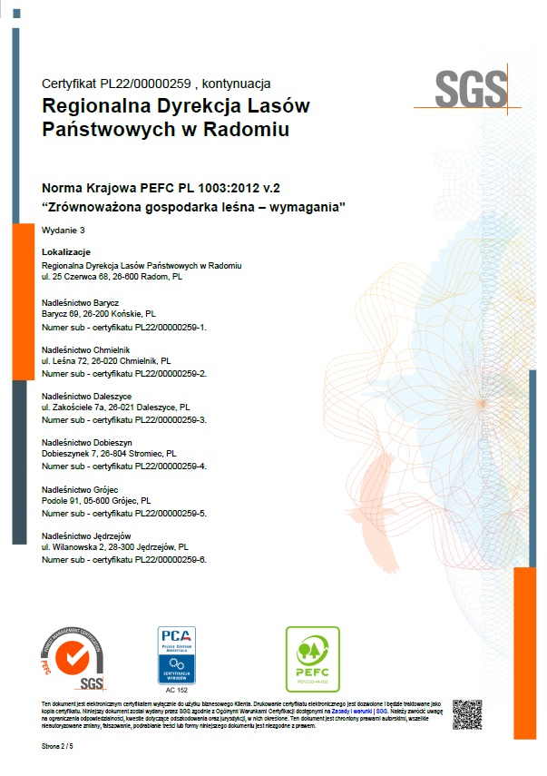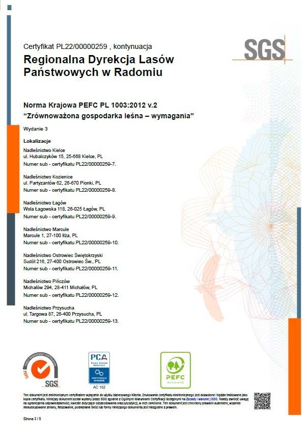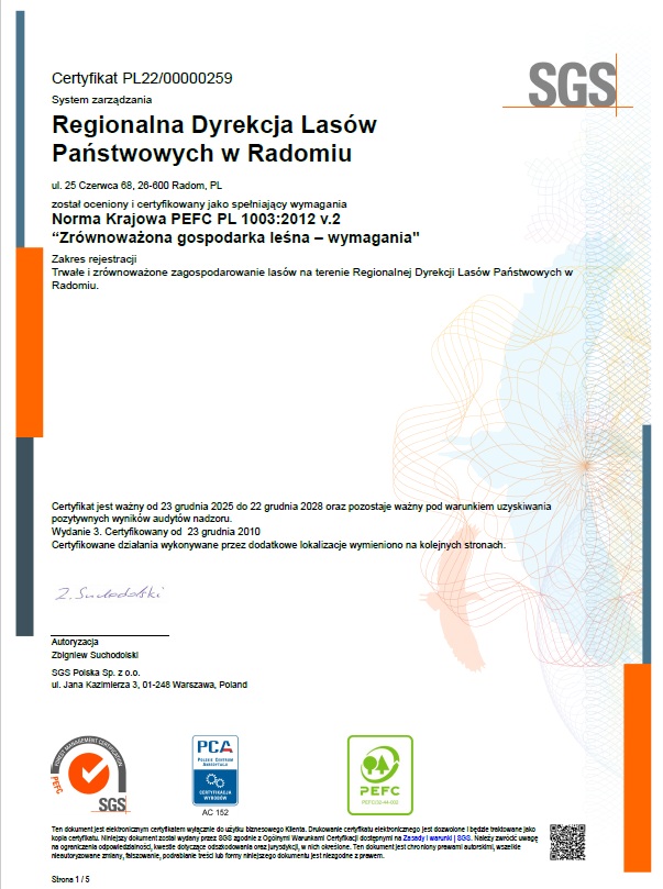 Decyzją Jednostki Certyfikującej SGS Polska Sp. z.o.o. system zarządzania Regionalnej Dyrekcji Lasów Państwowych w Radomiu został zarejestrowany jako spełniający wymagania Standardu PEFC. Certyfikat PEFC jest ważny od 23 grudnia 2025 r. do 22 grudnia 2028 r. Jego numer to PL22/00000259. Odrębne numery subcertyfikatów przyporządkowane poszczególnym nadleśnictwom wyszczególnione zostały na poniższym skanie certyfikatu i w załączniku (plik pdf ze skanem certyfikatu).