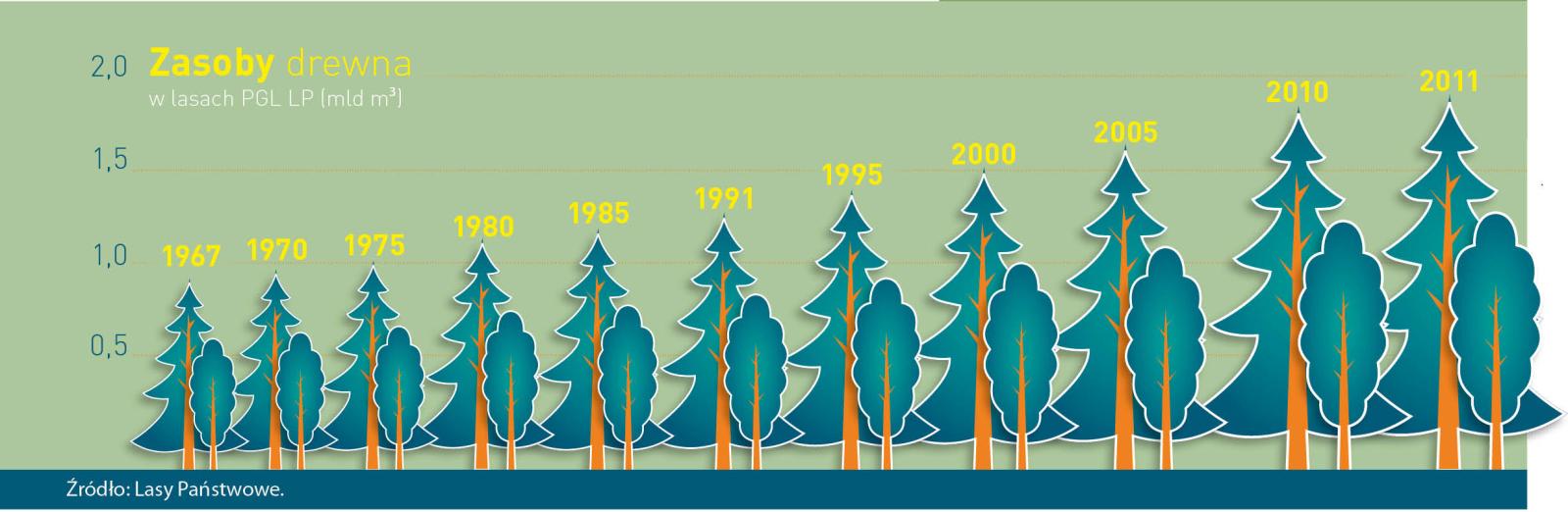 Stale rosnąca zasobność drzewostanów, a tym samym przyrastające zasoby drewna w Lasach Państwowych umożliwiają stopniowe zwiększanie jego pozyskania.